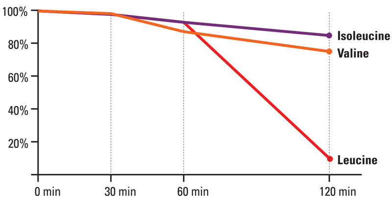 1. Conventional BCAA’s are not stable in lower pH (acidic) conditions, thus degrade and become less effctive.